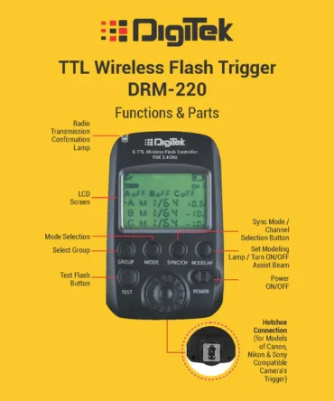 • Digitek (DRM-009) 2.4G Triggering Solution (DRM-009) Transmitter is Most Suitable triggering Solution for Digitek Electronic Flash Speedlite DFL-088.