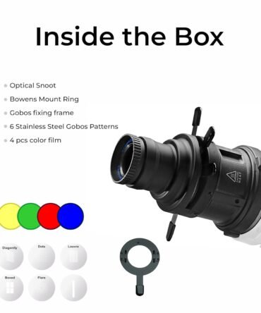 • Digitek (DS-240) Bowens Mount Optical Snoot Projector Kit with GOBO Frame & 4 Color Films, 6 Stainless GOBO Patterns, 38° Lens for LED Lights, Sharp Image Projection, Fit for LED Continuous Lights.