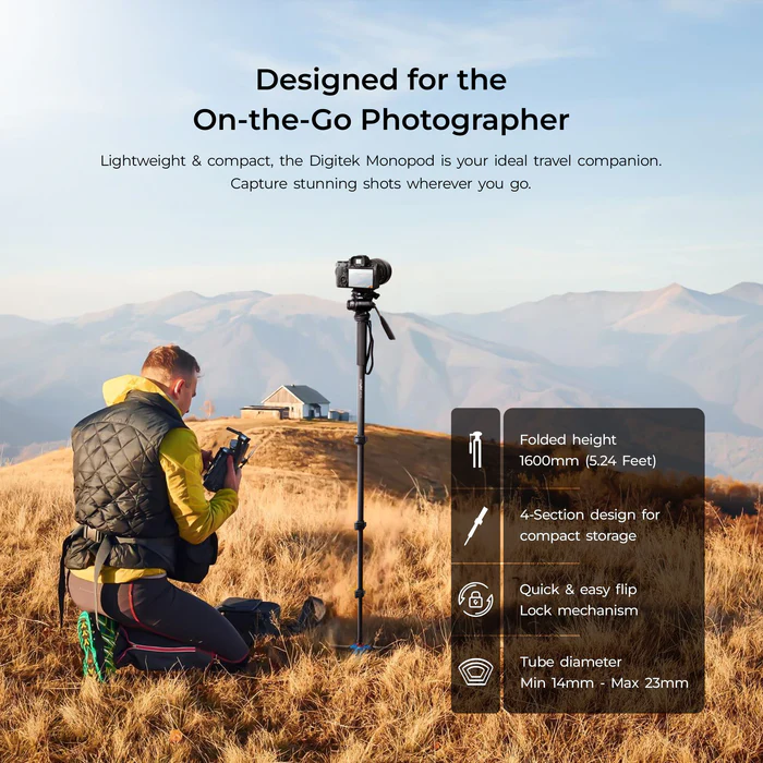 - 1600mm FOLDABLE MONOPOD WITH VIDEO HEAD: Digitek 1600MM DMP 55 LVH designed for smooth and stable photo and videography, featuring a video head and tripod leg base for extra stability.