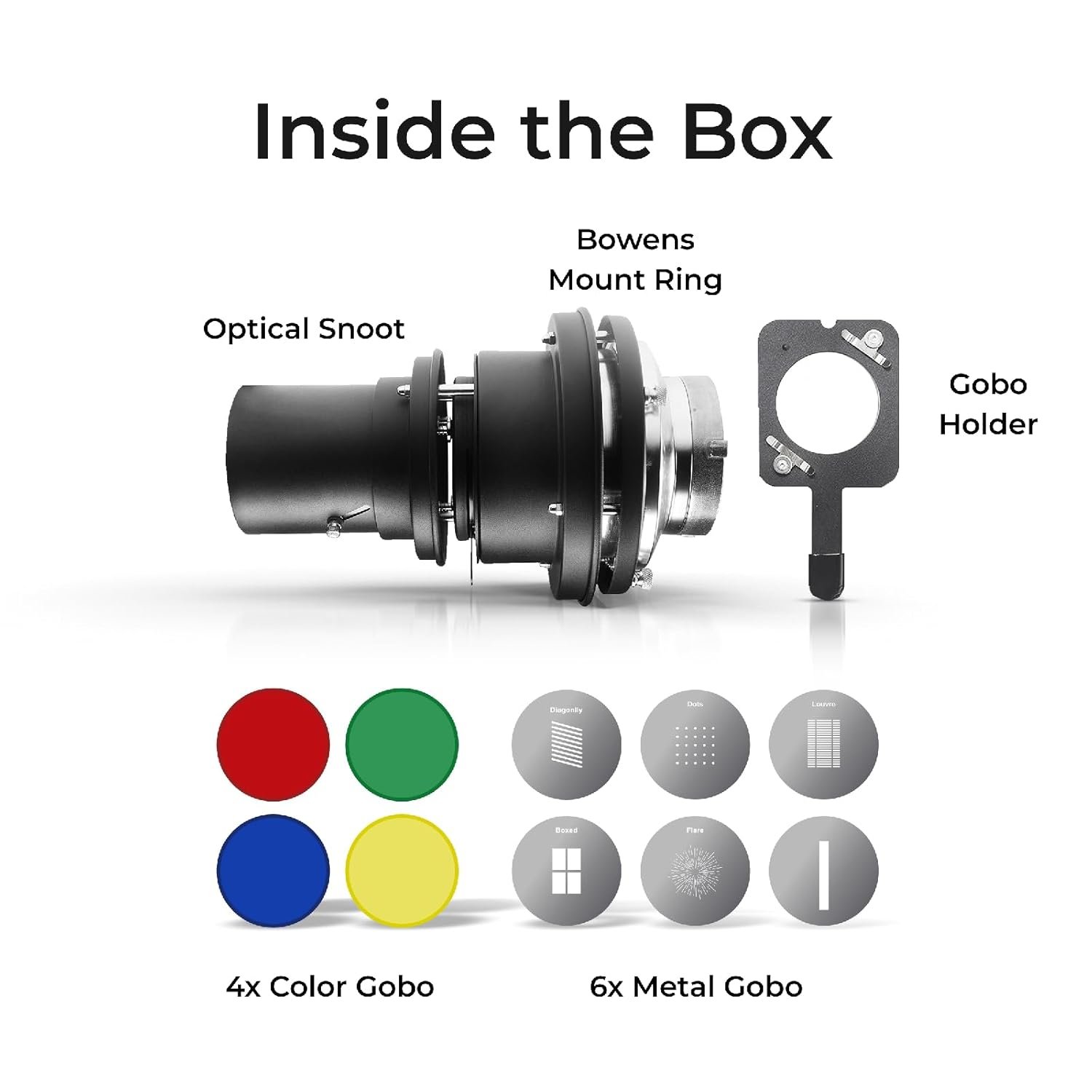 - KIT INCLUDE : 1 x Optical Snoot, 1 x Bowens Speed Ring, 1 x Gobo Holder, 6 x Stainless Steel Gobos, 4 x Color Gels (Red / Yellow / Green / Blue).