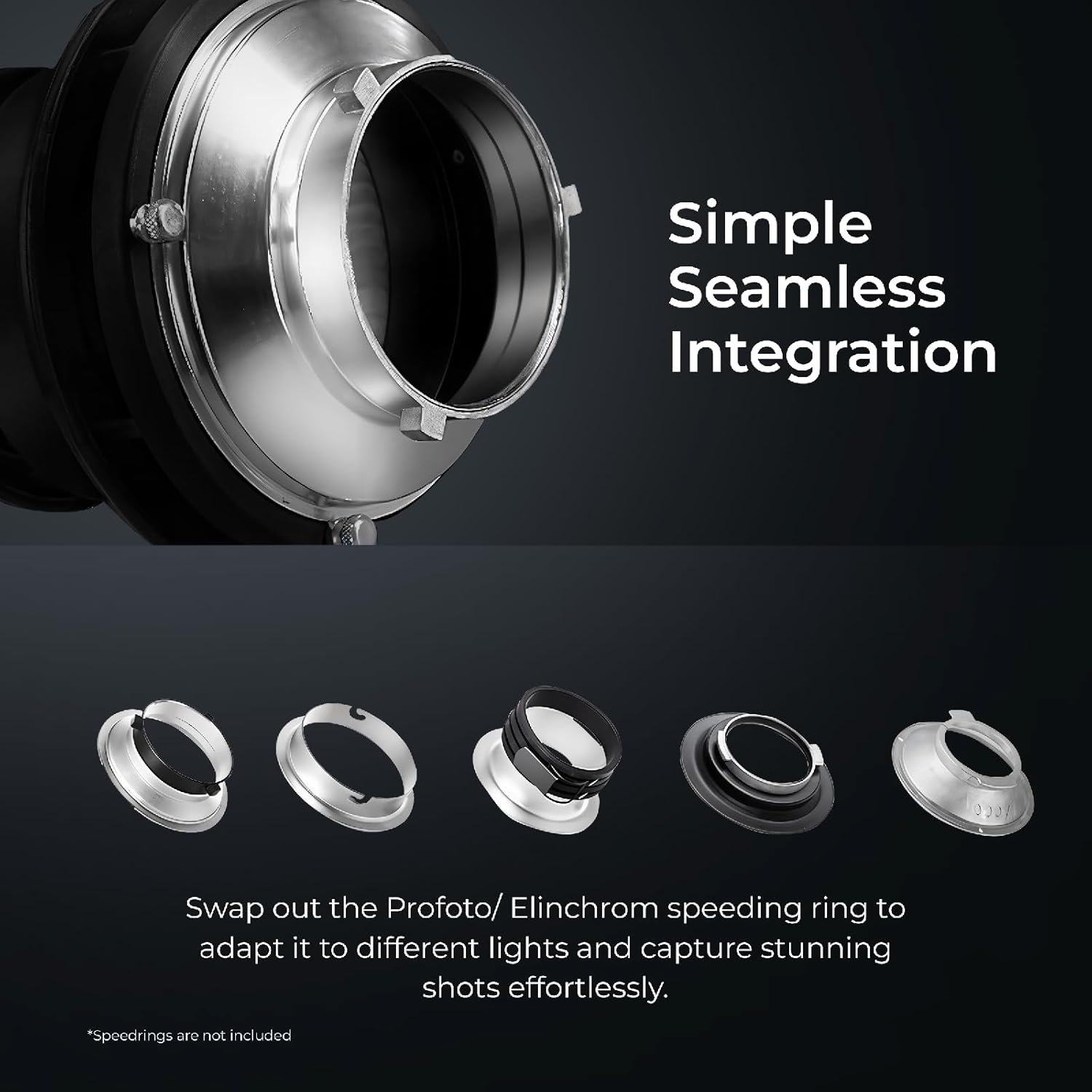- COMPATIBILITY: Original designed with Bowens Speed Ring, could replaced by Elinchrom Speed Ring. Changeable chucks with various bayonets. The size of the chuck is 1 52mm.