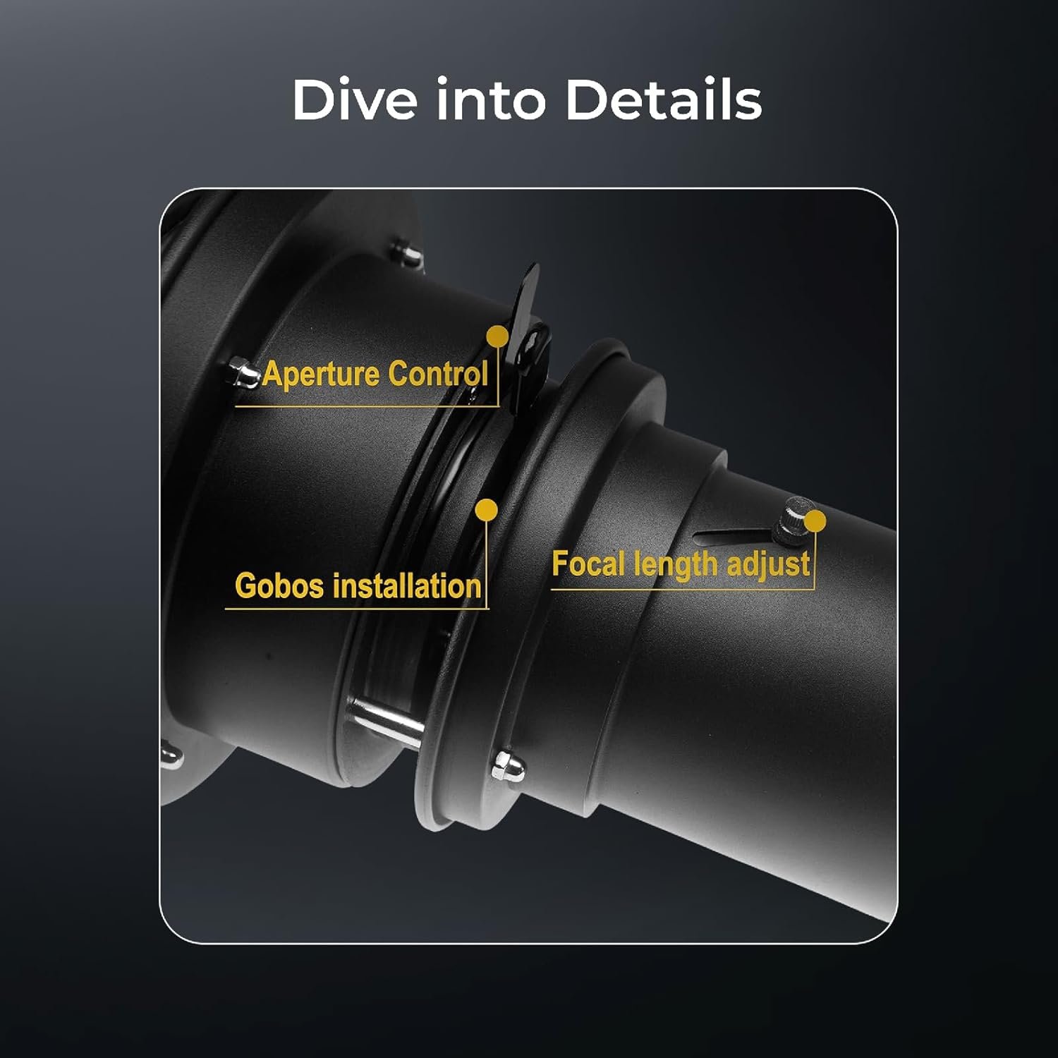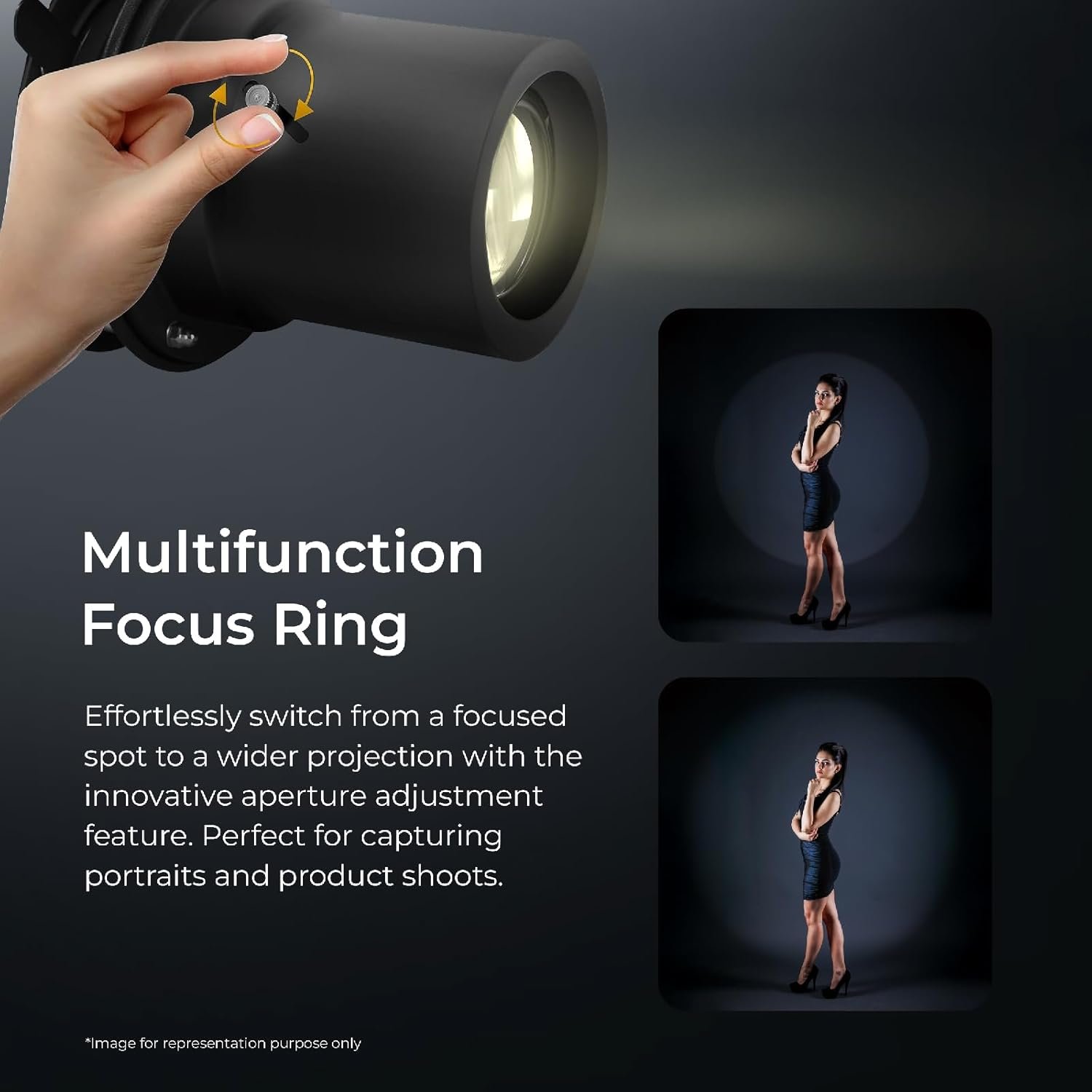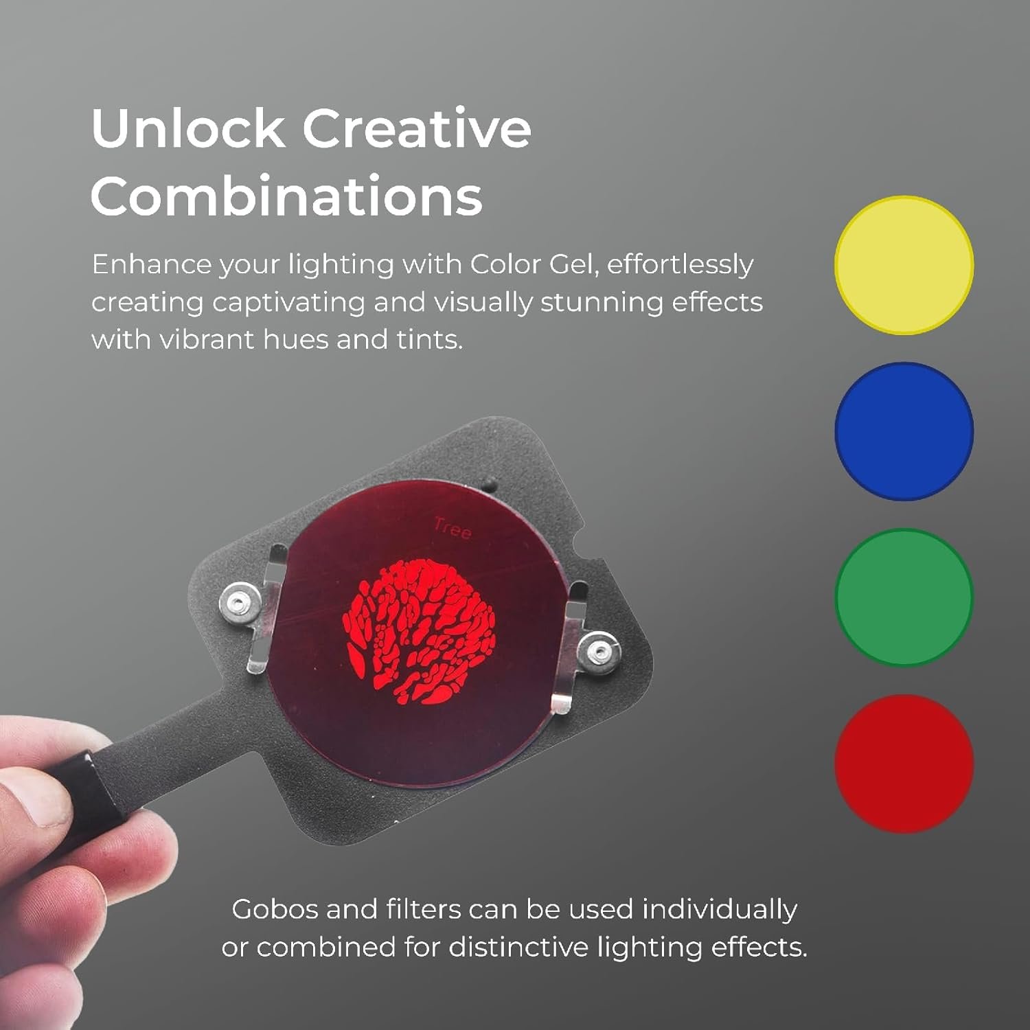 - FLEXIBLE CREATION: Gobos and Color Gel could be used together or alone to achieve awesome Light Effects. Providing more abundant resources for creative shooting. MULTI-FUNCTION: By changing the Aperture size manually get the Projection from Spot to Wide. Firstly focus ring design can make projection clear. Very suitable for photographers to shoot Portrait and product Photo shoots.