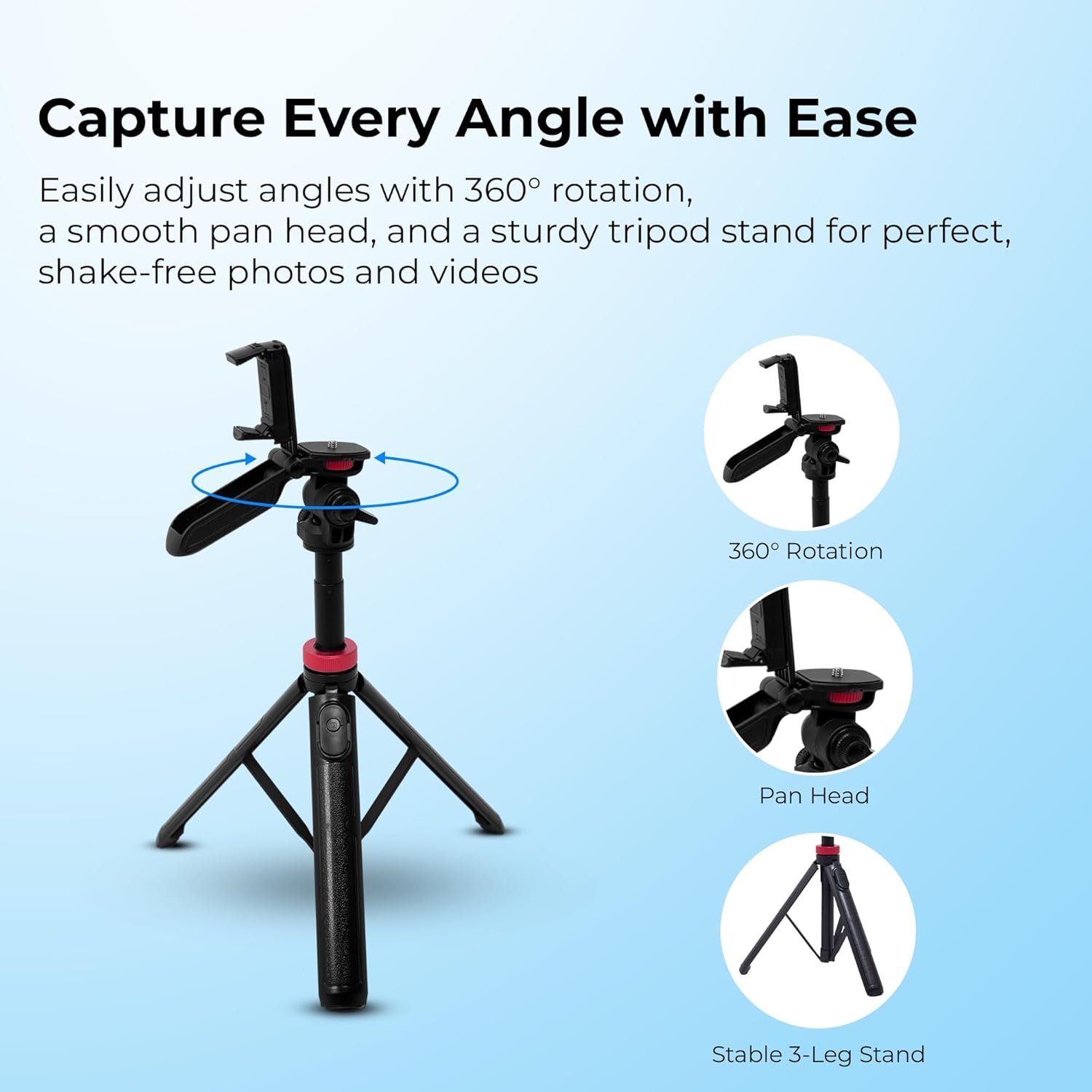 - 360° ROTATION & PAN HEAD: Allows full horizontal rotation and smooth panning for dynamic angles and cinematic shots.