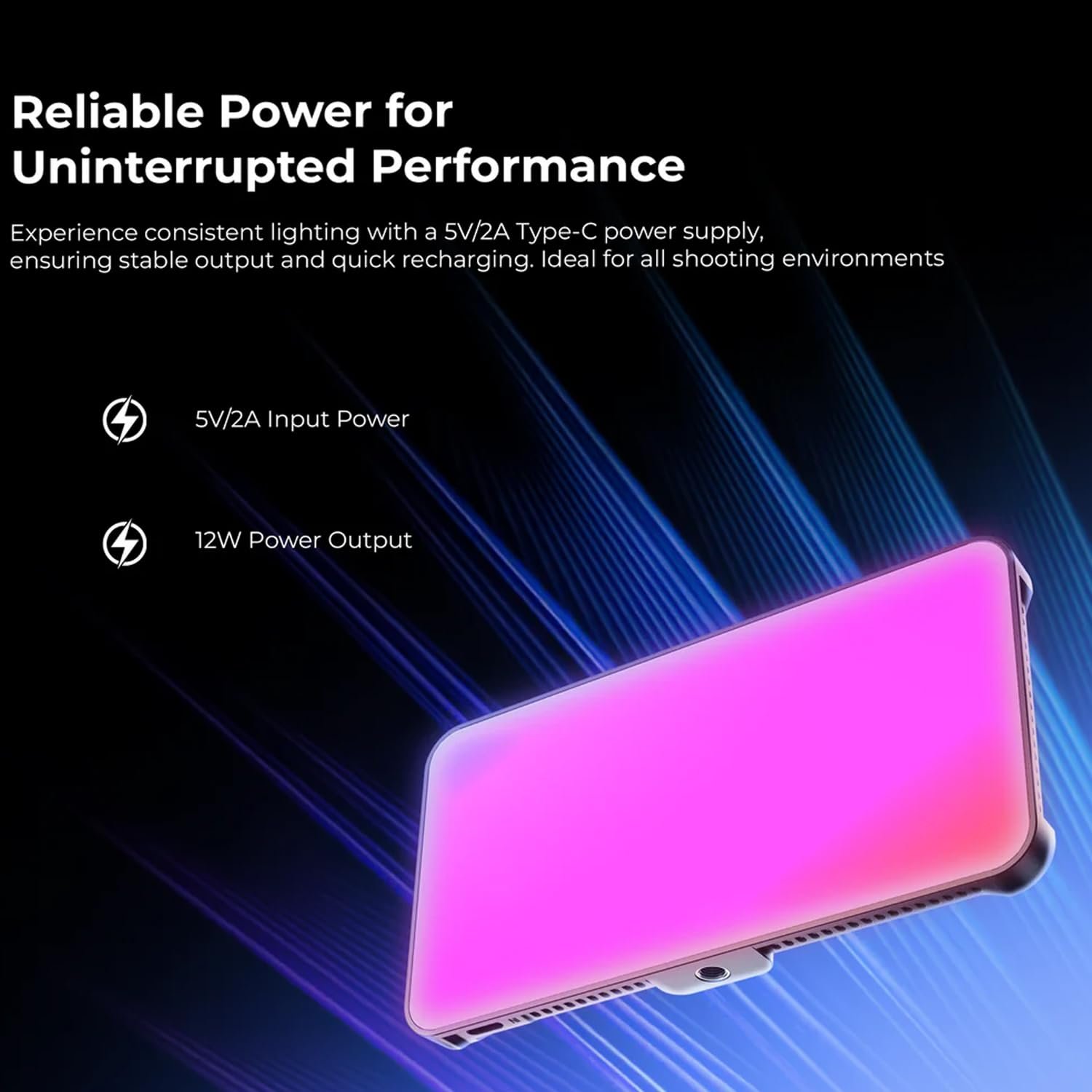• Powerful 12W Output with Built-in Battery – Equipped with a 12W high-efficiency LED and a built-in 4000mAh Li-ion battery, this portable RGB video light delivers reliable performance for up to 80 minutes at full brightness—perfect for on-the-go photography and videography.